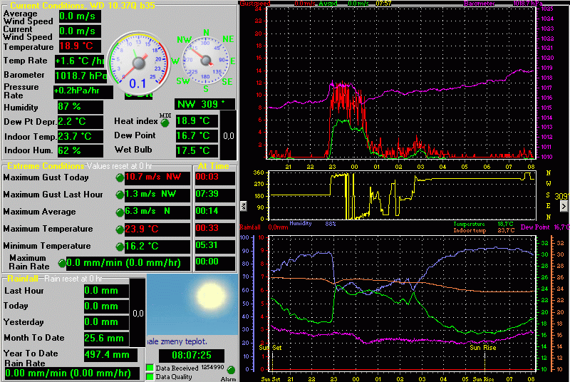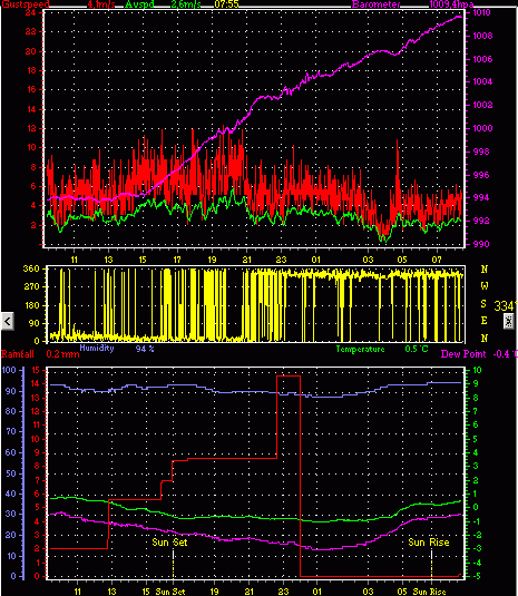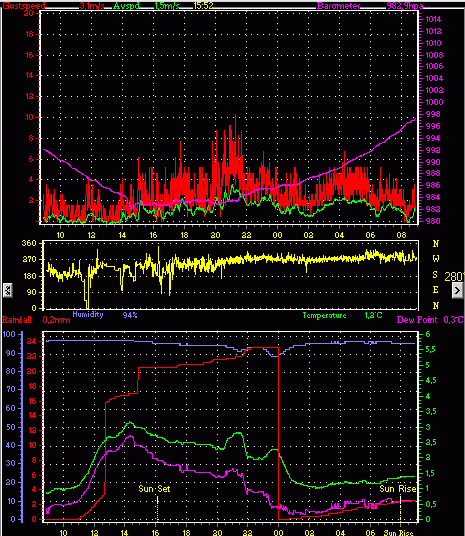 Maximálního nárazu zde dosáhl vítr ve 23:33, a to 13 m/s od severu. Silný